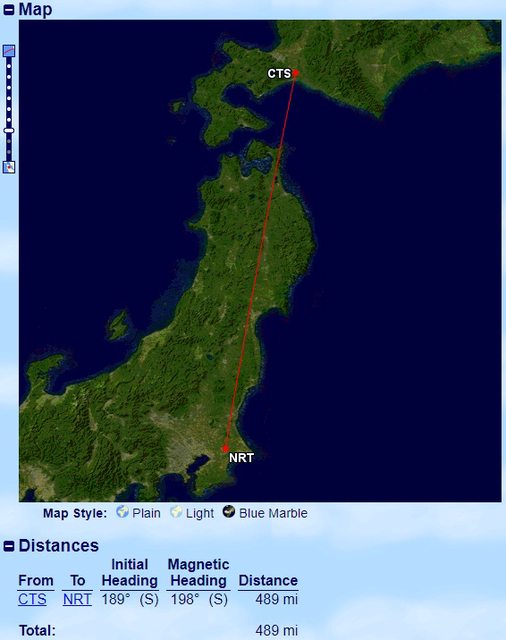 札幌到東京成田距離為489miles,預計飛行時間為1小時35分鐘。