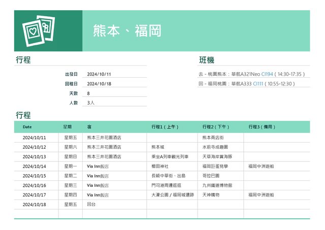 各位板友好,下周要帶父母遊北九州共8天7夜,熊本進福岡出