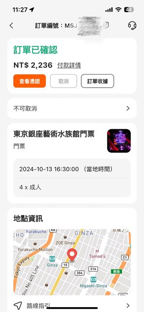 10/13銀座藝術水族館門票(16:30),共4張