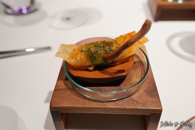 第七道也是沒有寫在菜單上的食材,是有點像天婦羅的炸餃,使用日式的木箱襯托,是再