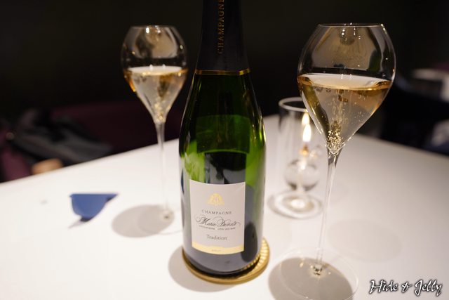 是這瓶產自法國的「Marie Demets」酒莊的香檳,就送上了我們的桌子,我們選擇了店家