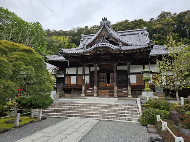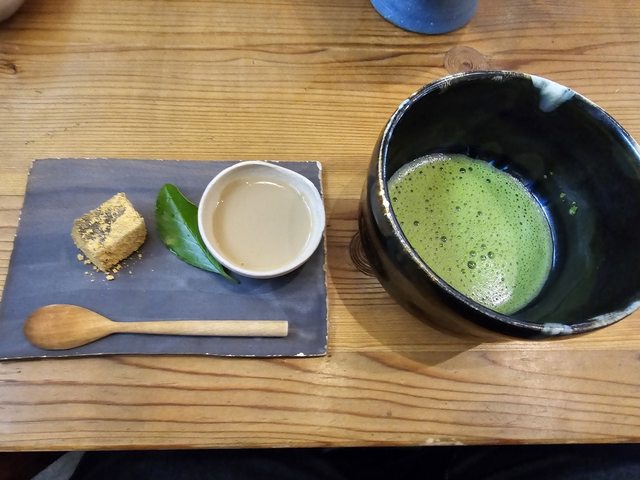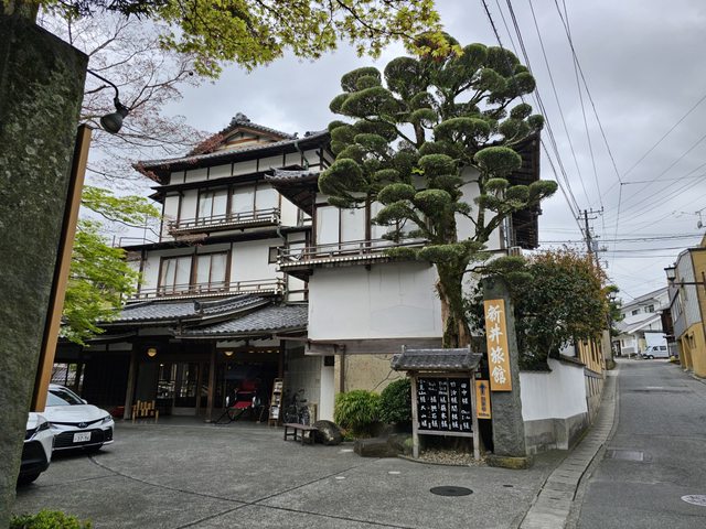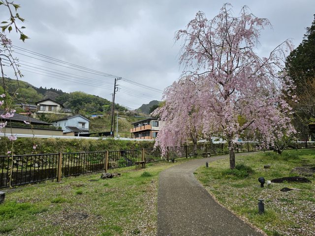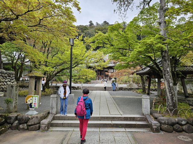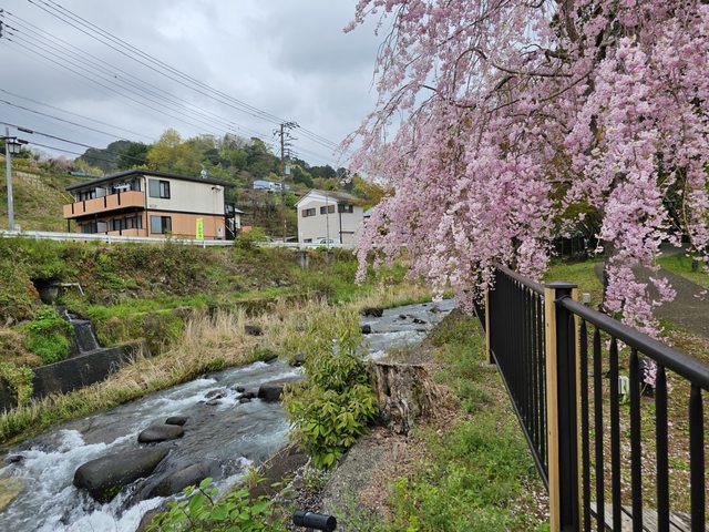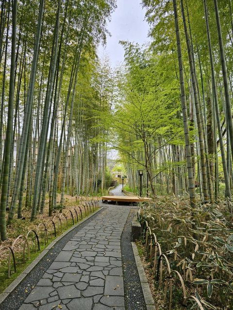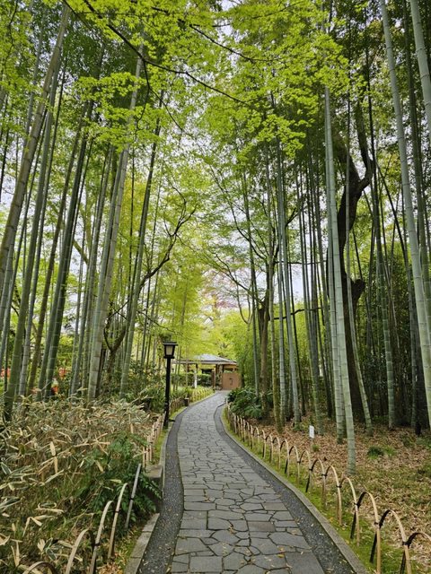 路上不少古色古香的建築,竹林小徑旁邊的赤蛙公園裡有幾株盛開的櫻花,搭配旁邊的小