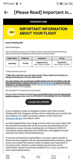 不知道是否有人跟我一樣收到11/03 札幌飛台北的航班更改資訊,如下