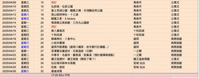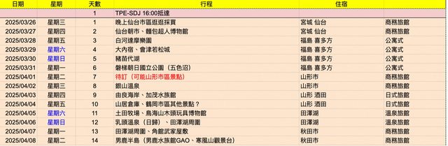 1. 出遊日期:2025.03.26-04.26