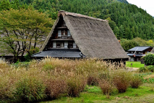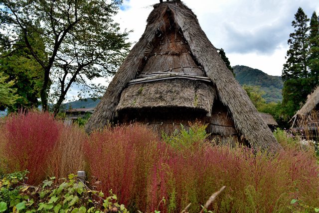 [原始的合掌屋,前面還有變色的掃帚草]