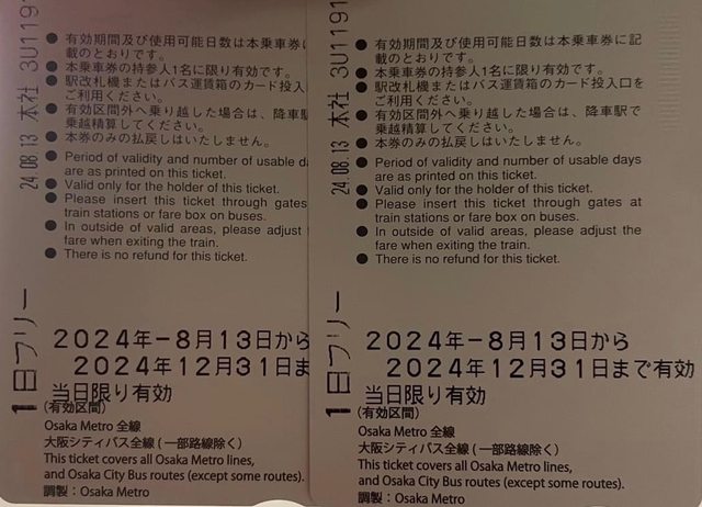 大阪地鐵一日券實體票2張