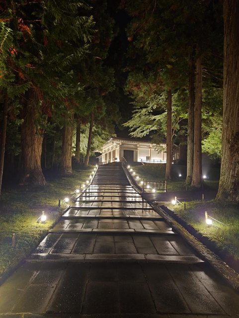 接著前往一關的東橫inn放行李,搭再來線去平泉,走路到中尊寺看紅葉銀河,雖然還沒見頃,但舊覆堂有小提琴演奏,夜間點燈也很到位。
