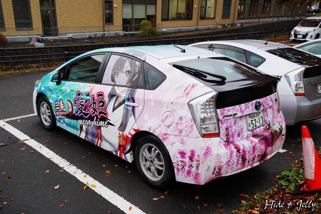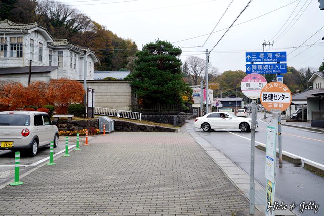 往三春城的方向會穿過三春町役所,停車場停了一台愛姬彩繪車,後面還有繽紛的三春瀧