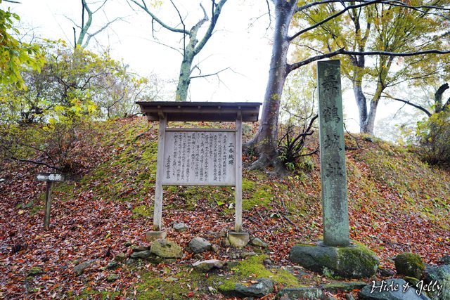在本丸裏門的位置,立著「舞鶴城址」的石碑,一旁說明了三春城的簡單歷史,特別提到