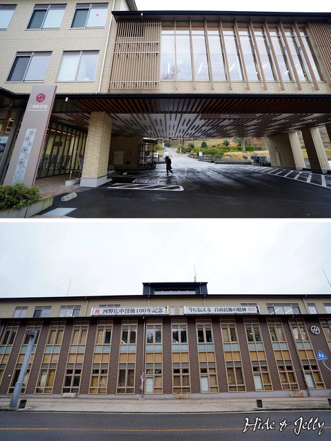 町役場的大門還蠻氣派的(上圖),正面則高高掛著「河野広中沒後100年紀念 今後傳承