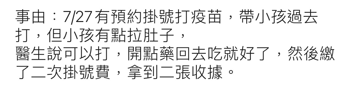 → hobbes : 收據就二張,二張掛號費,內容不同(看診和打疫苗) 08/04 11:39