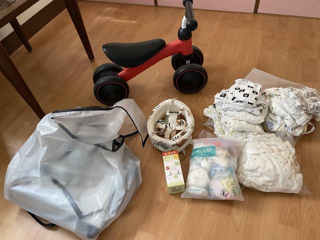 物品名稱:二手滑步車、二手推車雨衣(通用款)、9成新防撞帽、XL奶嘴頭全新剩3顆、紗布衣約15件(適合秋冬寶)