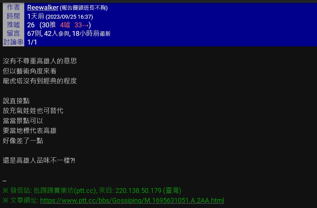 ※ 文章網址: https://ptt-club.com.tw/Kaohsiung/M.1695705901.A.11D