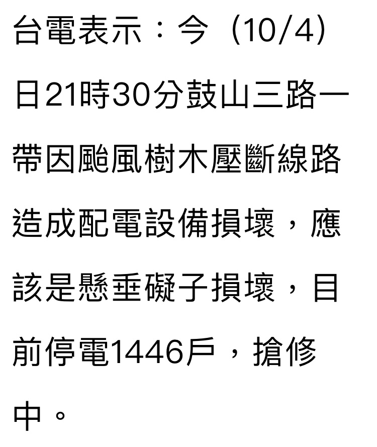 推 chopinn : 鼓山三路也停電 10/04 21:43