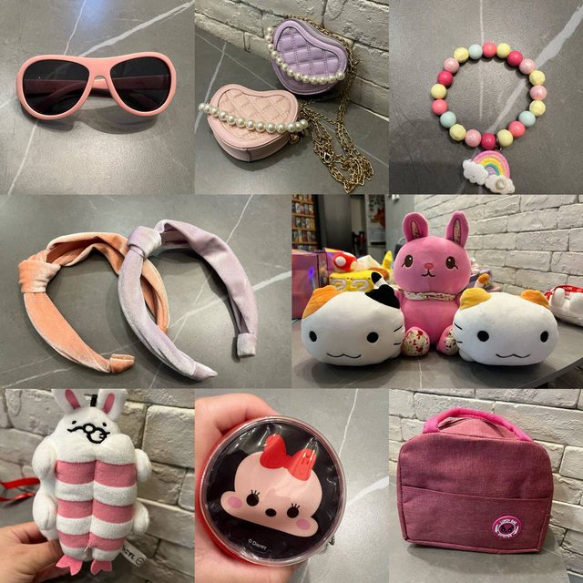 物品名稱: 1、SHADEZ 7歲以下太陽眼鏡 約8成新 2、H&M絨布髮箍 桃粉色、紫色各一 3、NET 愛心小包 粉色、紫色各一,金鏈子有褪色 4、彩虹亮粉手鍊 5、米奇零錢包 6、25公分布娃娃3個 7、壽司郎娃娃證件夾 全新 8、粉色保溫餐袋 全新 欲換物品:8樣全部一起換5包好市多衛生紙或2罐300ml依必朗洗手露 欲換地點:三民區教仁路某大樓管理室