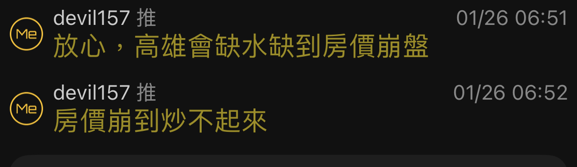 噓 a13471 : 在那叫什麼 又不是整個高雄都沒水 不會去有水的地 01/29 17:35