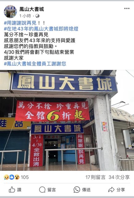 推 chillybreeze: 又倒了一間書局,鳳山書局少好多啊03/01 10:42