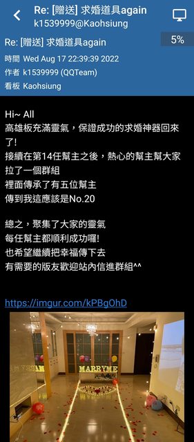 謝謝大家的祝福,也請需要用到的人兒不用客氣的私信我哦 終於找到上一代的神器繼承人,還很熱心地不辭勞遠的開車送到我家,真的是太感謝高雄版 的熱情鄉民 小弟已於上周順利完成任務,目前神器在我這裡,有需要的版友請再私信我,以讓神器再繼 續傳承下去,不要斷送在我手上RRRRR… https://lurl.cc/LTdCD https://lurl.cc/q83tx https://lurl.cc/I5t5j ※ 引述 《Trident77》 之銘言: : 標題:[問題] 求婚神器借用 : 時間: Thu Feb 22 13:15:24 2024 : : 請問板上流傳的求婚神器在哪位大大手上呢, : 小弟近期要求婚想要借用, : 面交地點高捷紅線沿線,謝謝 : : -- : ※ 發信站: 批踢踢實業坊(ptt-club.com.tw), 來自: 110.28.40.177 (臺灣) : ※ 文章網址: https://ptt-club.com.tw/Kaohsiung/M.1708578926.A.41E : 推 jc0615 : 好奇什麼是求婚神器 求解 02/22 15:01 : 推 Pringle : 這個嗎? https://i.imgur.com/7KVG621.jpg 02/22 15:16