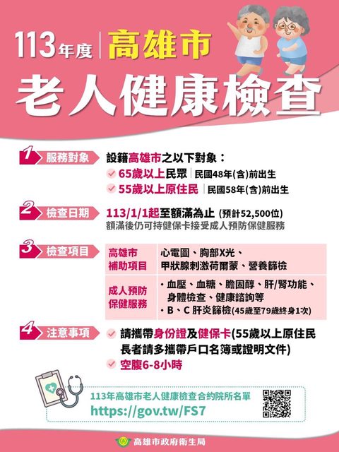 對象:設籍高雄市之65歲以上長者(民國48年(含)以前出生)及55歲以上原住民長者(民