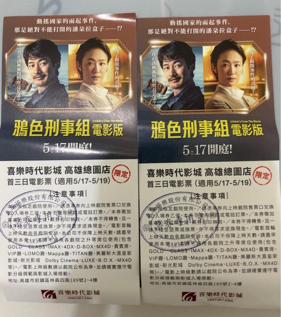 物品名稱:電影票鴨色刑事組*2,限5/17-5/19喜樂時代影城高雄總圖店觀賞