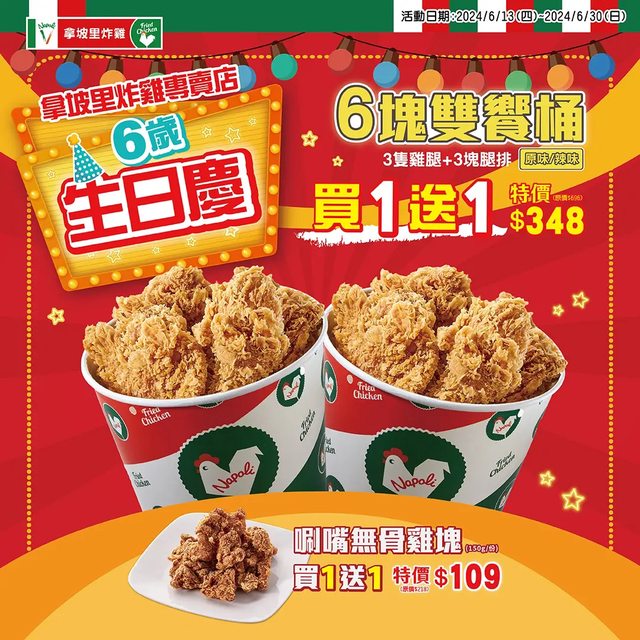 拿坡里現在剛好有六塊炸雞桶買一送一 348元的活動