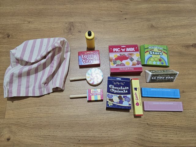 1.Le Toy Van 糖果零食木質玩具組,使用約2年,木頭玩具有碰撞痕跡或掉漆,收納的布袋