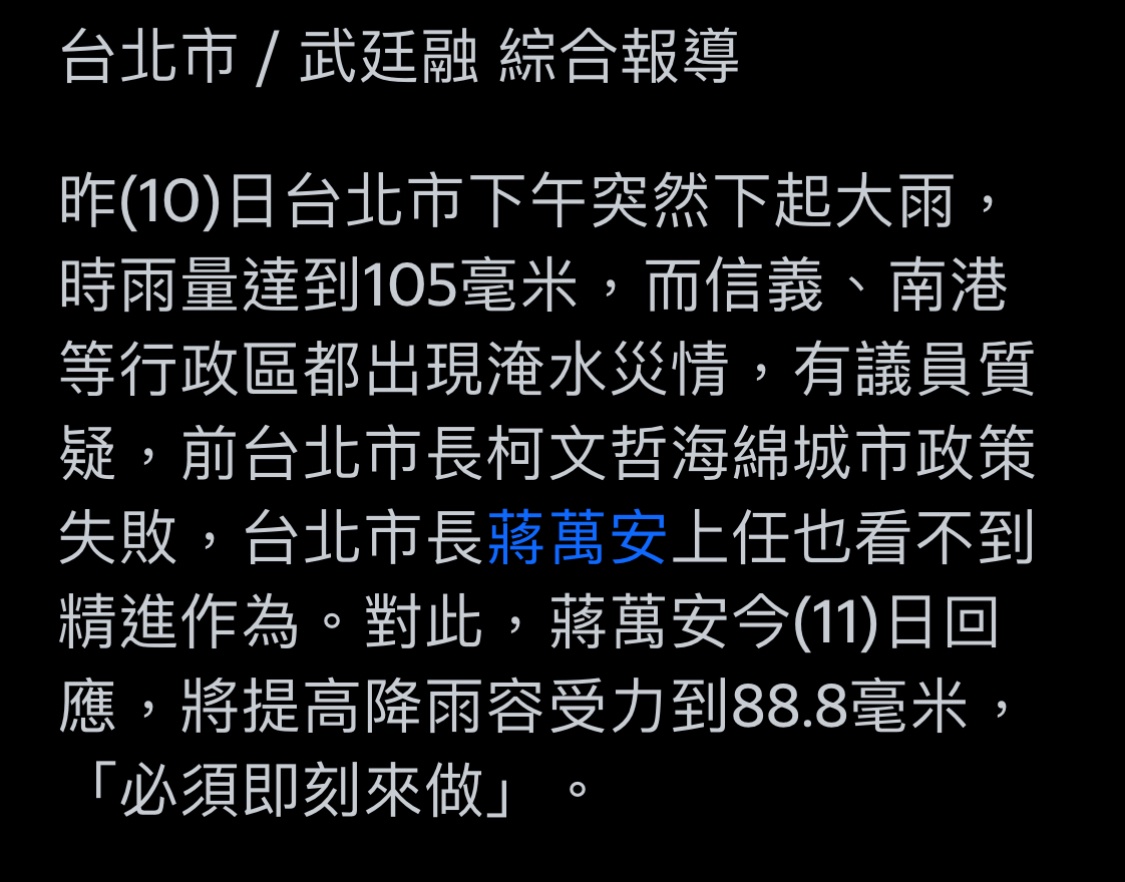 推 dragon159 : 台北自己當年還不是拿捷運當蓄洪池 國民黨執政淹的 07/27 22:53