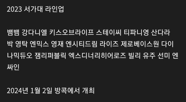 感覺這次SM所屬歌手也會獲得大賞的2024首爾歌謠大賞出席陣容 2024年1月2日在曼谷舉行 出席名單 BamBam、姜丹尼爾、KISS OF LIFE、STAYC、Tiffany Young、Dara、YOUNGTAK、NMIXX、榮 宰、NCT DREAM、RIIZE、ZB1、Dynamic Duo、JAM REPUBLIC、Xdinary Heroes、Billlie、 裕株、宣美、n.SSign 以其他頒獎典禮為標準來看,出席名單裡面完全沒有大賞等級的歌手。就算大賞隨便給SM的 偶像,在出演者之間也不會有問題的和平(?)的陣容就這樣誕生了 來源:https://theqoo.net/square/3023449139 1. 為什麼叫首爾歌謠大賞呢? 應該叫SM歌謠大賞吧,幹嘛邀請不是SM的歌手參加呢? 會給 他們參加獎嗎? 2. HYBE完全沒人參加ㄎㄎㄎ 3. 恭喜NCT DREAM~ 4. 去了拿不到獎,也沒有得到好的待遇,這樣還要準備舞台不是很吃虧嗎? 錢和時間都浪 費掉了。總之恭喜沒參加的團體 5. 我偶像沒去真幸福,希望永遠不會去 6. 首爾歌謠大賞本來就沒有公信度不是嗎? 這個不是SM歌謠大賞嗎? 7. 陣容確實有點弱,JYP有NMIXX,但Stray Kids沒有參加? 有行程嗎 8. 如果要給的話就給RIIZE吧,讓SM成為一間大賞經紀公司,go go 9. 只是SM的年末派對而已,何必千里迢迢跑到曼谷參加呢 10. 今天成績很好的歌手都沒參加ㄎㄎ 11. 因為SM歌謠大賞這個稱呼太有名了,所以可以理解大家為什麼沒參加 12. 如果能像AAA一樣有大家一起的節慶氛圍就好了,但是這裡每年都有專屬於SM歌手的節 慶的感覺 13. 感覺Music Bank年末結算的陣容都比這個好 14. 反正都要在曼谷舉行,就拿掉首爾兩個字,改成SM歌謠大賞吧 15. 在外國辦首爾歌謠大賞也很詭異ㄎㄎㄎ https://i.imgur.com/pz1uoGp.jpg