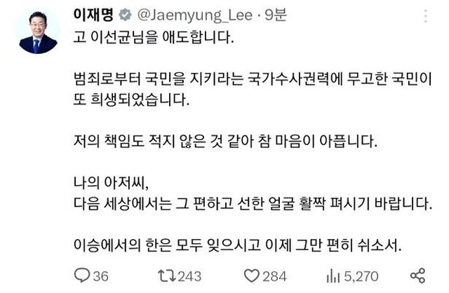 歲。對此,韓國國會議員李在明也在社群網站上哀悼:「又犧牲了一位無辜的公民。」但這