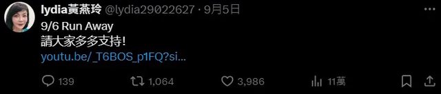 享女兒的MV和專輯預告。她昨日就在X上分享子瑜新歌〈Run Away〉預告,表示「9/6 Run