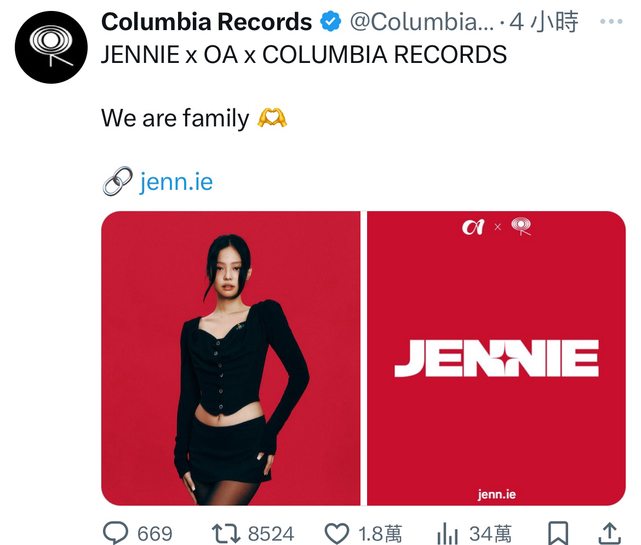 經紀公司OA今天表示,Jennie與美國大型唱片公司Columbia Records公司締結合作關係,