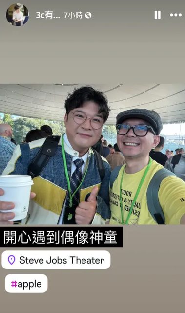 態中曬出巧遇神童的畫面,讓粉絲嗨翻。事實上,這是神童第一次受邀參加蘋果發布會,