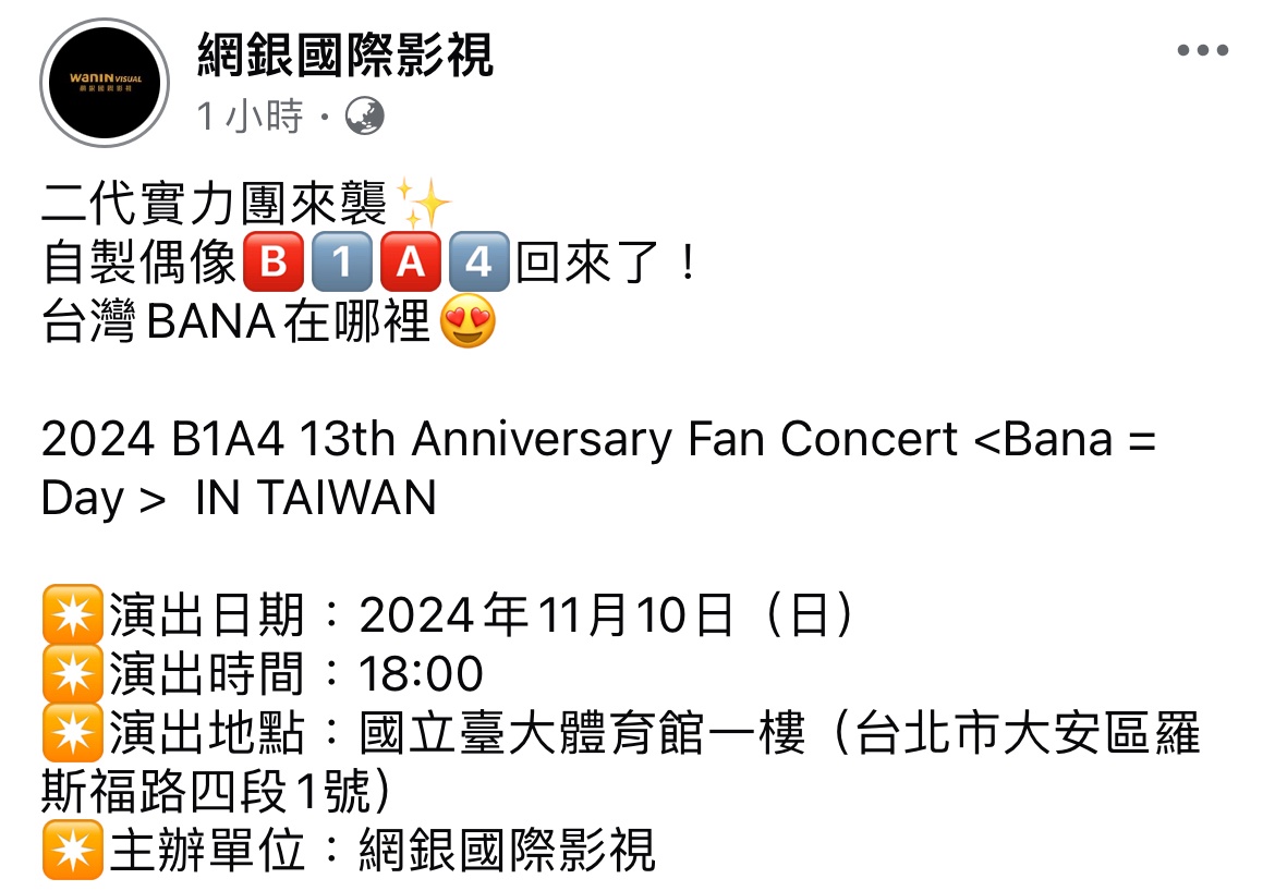 標題[情報] B1A4 13週年 Fan Concert 臺灣場11/10