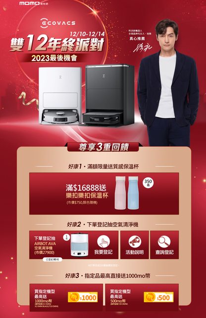 雙11沒花到錢,想說雙12是最後可以大肆購物的機會 就一直泡在購物平台上晃來晃去 雖然我已買 但看到優惠 獨樂樂不如眾樂樂,就跟大家一起分享囉 【momo (12/10-12/14)】 >下單滿16,888送保溫杯 >下單登記抽空氣清淨機 >買X2 omni / T10 omni 送1000 mo幣 >買T20 omni 送500 mo幣 X2 omni 白 $34,388 / 黑 $33,388 T20 omni $19,988 X1 omni $18,988 / (搭配耗材組) $21,500 T10 omn $16,888 / (搭配耗材組) $18,888 https://i.imgur.com/F3nb1tn.png