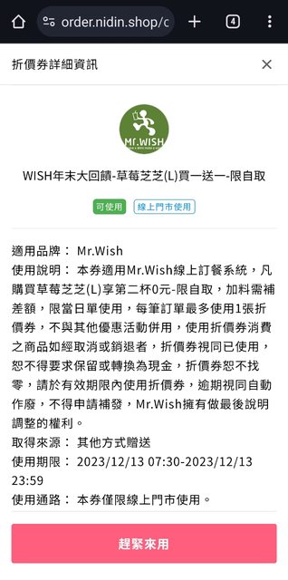 連續7天,天天不同飲品買一送一!! 同品項第2杯「0」元 12/13今日限定↓↓ #草莓芝芝L 買一送一券 (限自取) 點我領券 http://tinyurl.com/ywsyrrwe #蜜桃紅茶L 買一送一券 (限自取) 點我領券 http://tinyurl.com/ytrkdbm7 小提醒:點擊票券連結後,需先登入會員才會跳出折價券!! 登入後若無立即跳出折價券,需重新點擊票券連結即可成功 記得先領券再訂購,優惠不併用(限來店自取) 領取後當天店家打烊前未使用,則會失效 單筆訂單限用一張折價券唷~ ---------- 領取票券教學看這裡↓ 領券與兌換步驟說明: http://tinyurl.com/ywsyusll ---------- 若為iOS系統用戶,無法成功領券者 需查看留言區另一則 iOS 領券教學(含解說影片) -- ※ 發信站: 批踢踢實業坊(ptt-club.com.tw), 來自: 223.138.112.165 (臺灣) ※ 文章網址: https://ptt-club.com.tw/Lifeismoney/M.1702445289.A.47D
