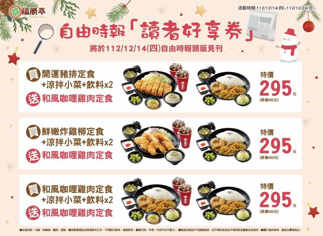 2023最後一個月大家好嗎? 小編最喜歡的月份就是12月了~ 因為除了會有聖誕節滿滿的幸福感 還會有許多好消息~ 嗯?問我有什麼好消息? 這不就來了嗎 購買今日的自由時報即可獲得 福勝亭「買套餐送主餐」的優惠喔 簡直是超級划算! 兌換日期:112/12/14-112/12/24 有買到報紙的粉絲們 記得在12/24日前兌換呦 -- ※ 發信站: 批踢踢實業坊(ptt-club.com.tw), 來自: 101.137.245.40 (臺灣) ※ 文章網址: https://ptt-club.com.tw/Lifeismoney/M.1702531623.A.2E4