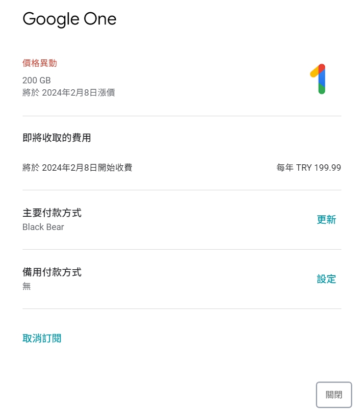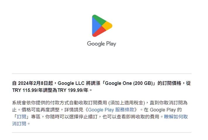 我是土耳其人,年中訂閱的,自動扣款好幾個月了。 最近發Email說要漲價,說12月扣款就是漲價後的價錢。 今天是扣款日,結果就把我的帳號自動終止合約了,要續訂閱就失敗了,認定非土耳其人了 吧。 看來明年Google one續定也不妙了。 -- ※ 發信站: 批踢踢實業坊(ptt-club.com.tw), 來自: 180.217.15.83 (臺灣) ※ 文章網址: https://ptt-club.com.tw/Lifeismoney/M.1702535948.A.840