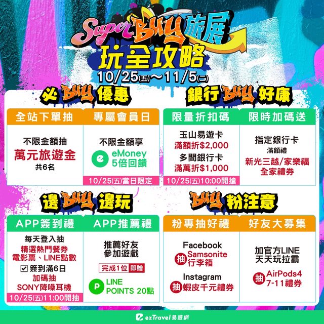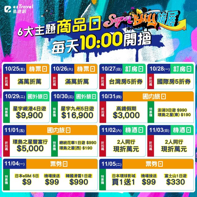這邊整理一下比較吸引人的優惠 10/25~10/26 機票滿萬折萬折扣碼 10/27 台灣飯店5折券 10/28 國際飯店5折券 10/29 星宇峴港4日 $9,900 10/30 星宇九州5日 $16,900 11/4 日本網卡$9 11/5 環球影城買一送一 其他活動還有 https://i.imgur.com/leDpu6A.jpg