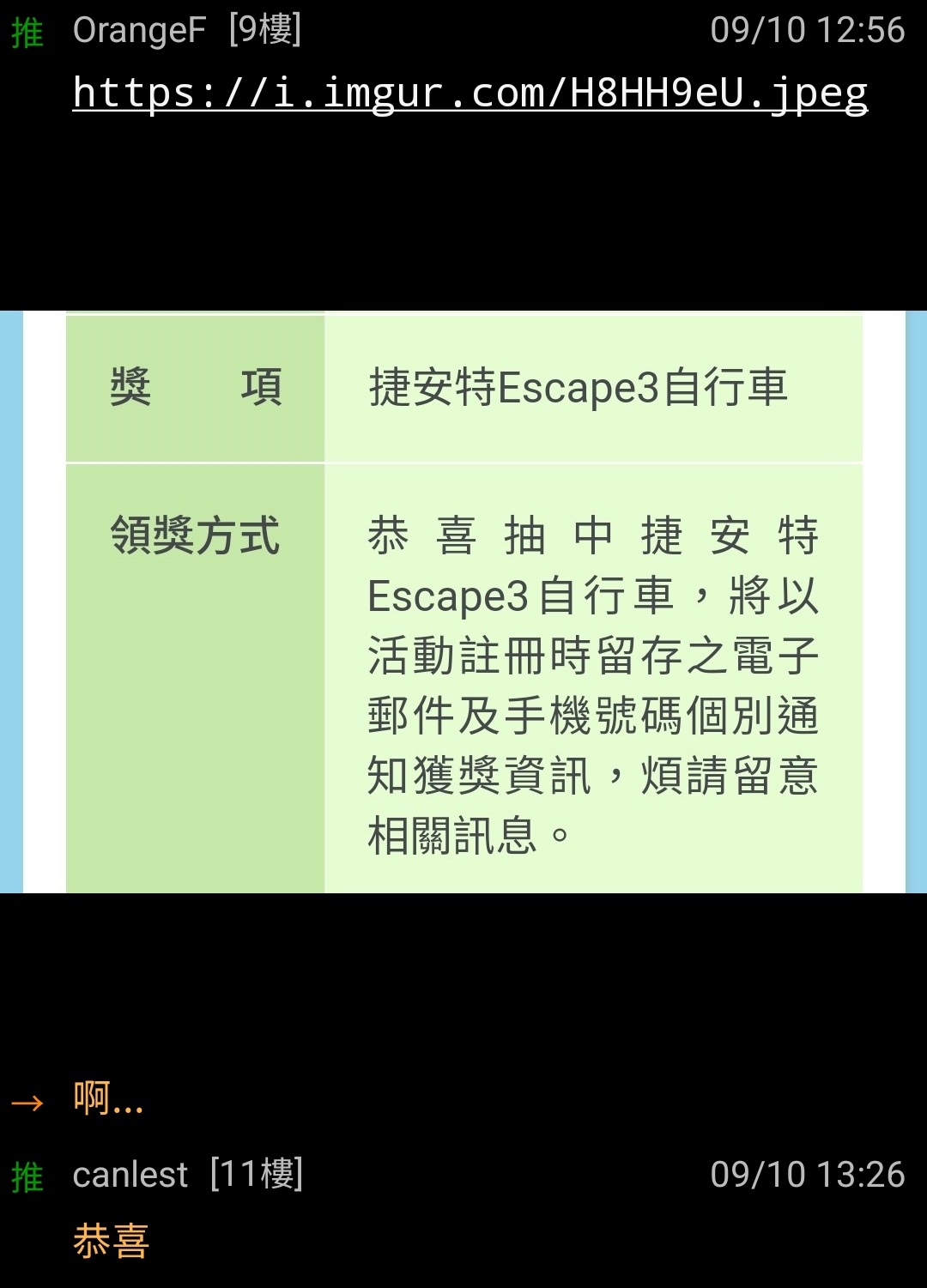 → clarafly: 有鄉民中獎啊,應該就是中捷安特又中Mac 125.229.103.85 10/29 17:08