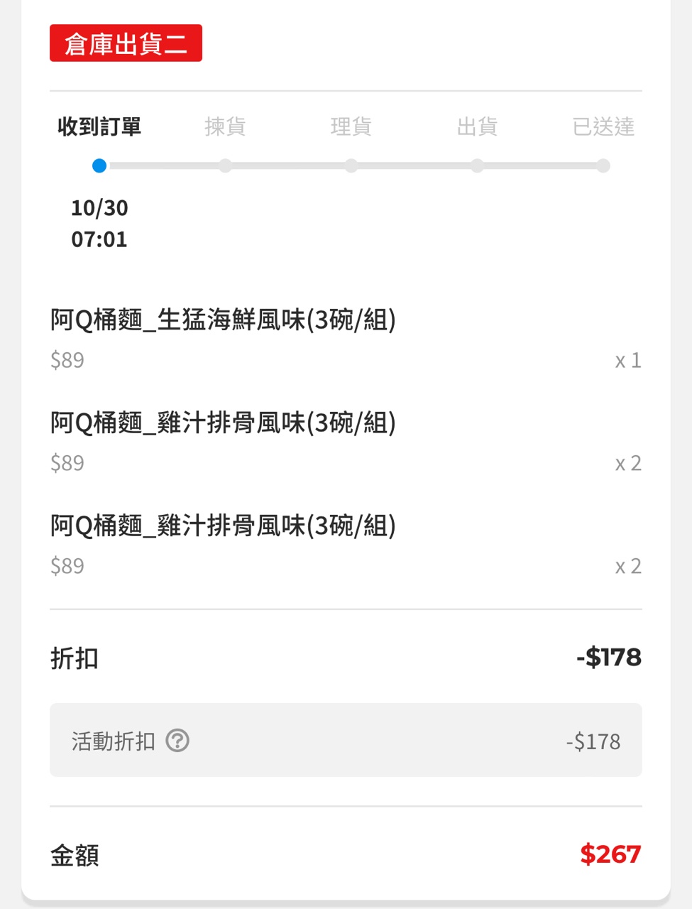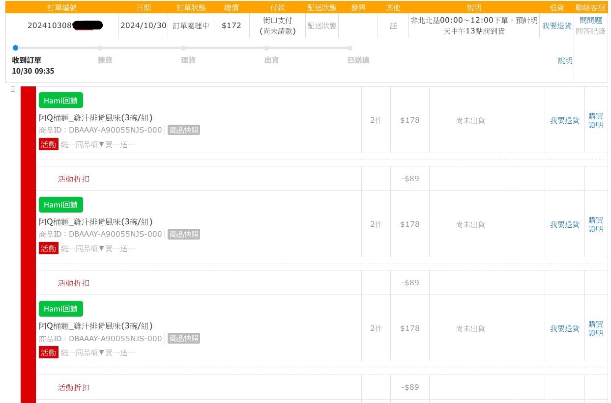 剛剛在PCHOME 閒逛,想把快要到期的80P 用完 看到這個:阿Q桶麵_雞汁排骨風味(3碗/組) 只要89 跟自己去賣場搬差不多,就點下去了 結帳的時候看了一下不對呀,怎麼還有活動!? 而且是買一送一!? 還很認真地確認了一下不是即期品 下方有寫備註 效期說明: 以消費者收受日起算,至少距有效日期前45日以上。 消費者收受商品之有效日期若短於上述期間,本公司將於接獲通知後協助辦理退換貨。 等於是6碗只要89! 一碗不用15元~ 超划算! 馬上訂了兩組~ 缺點是接下來有一陣子都只能吃泡麵當消夜點心了 XD -- ※ 發信站: 批踢踢實業坊(ptt-club.com.tw), 來自: 111.248.98.218 (臺灣) ※ 文章網址: https://ptt-club.com.tw/Lifeismoney/M.1730244200.A.3F9