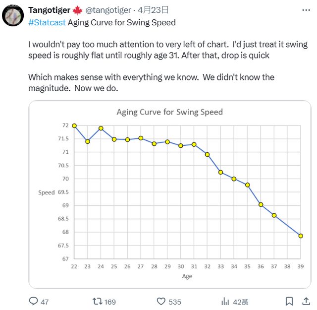 平均每年揮棒速度會下降0.5mph左右