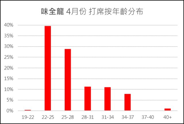 們還是可以看出樂天有著最多30歲以上的球員打席(30.2%),包括了朱育賢(33歲)、林泓育(