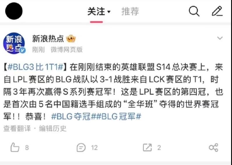 《環球時報》3日凌晨1時30分在微博上發出快訊,稱BLG(Bilibili Gaming)以3:1的成