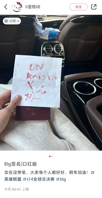 在BLG超話下粉絲與選手合照的照片之一 底下留言: 不敢相信 Bin 已經把大家都宰了 還以為是血書 -- 鷹嶺ルイ推 https://imgur.com/Bybr2Vi.jpg
