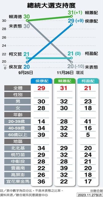 蕭配28%與侯康的14%;40至59歲的選民中,侯康配為34%與賴蕭配32%不相上下;60歲以上