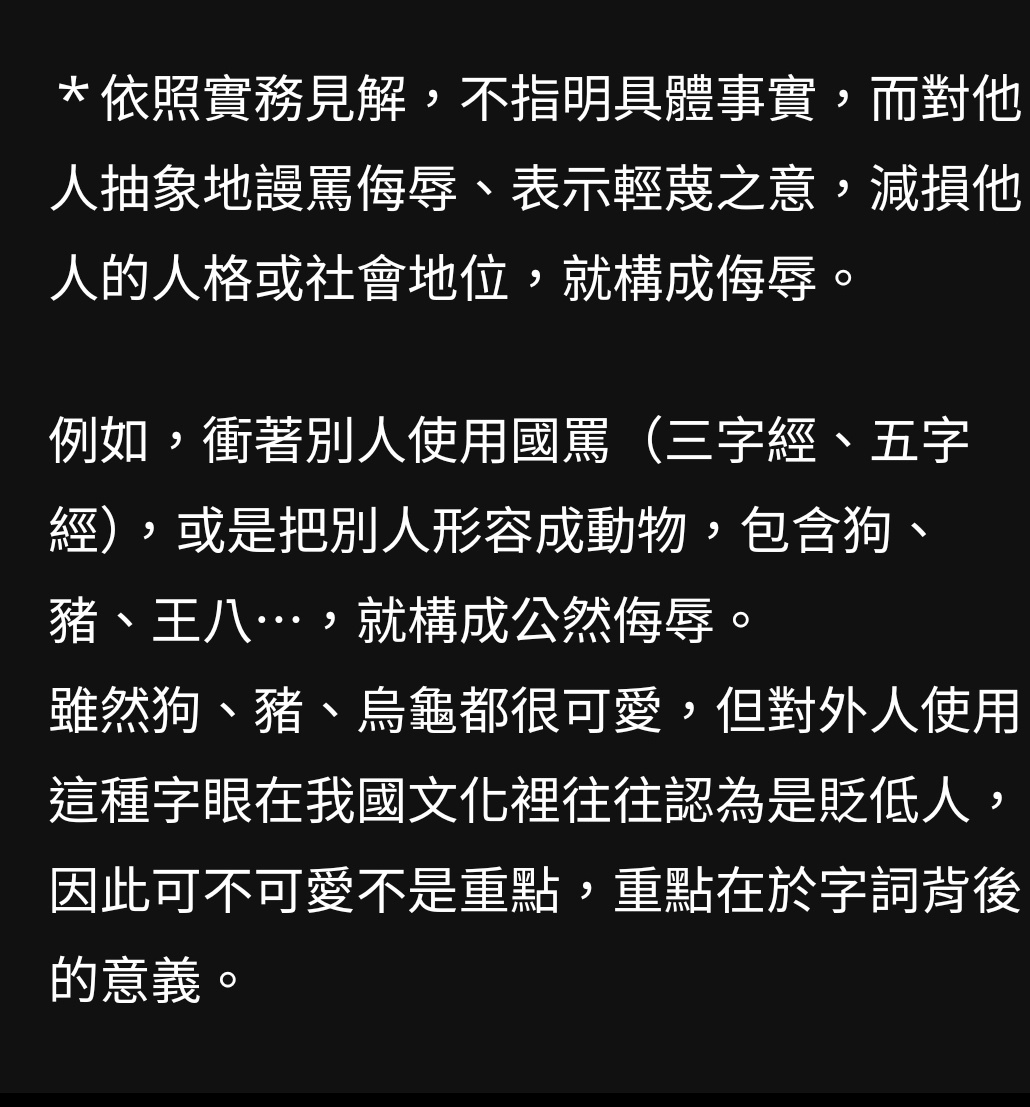 → manman0324 : 初。造成他人感覺受辱貶低成案與否交由檢察官判決。 06/19 04:30