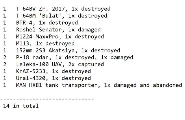 烏克蘭確認自上次更新以來增加的損失: