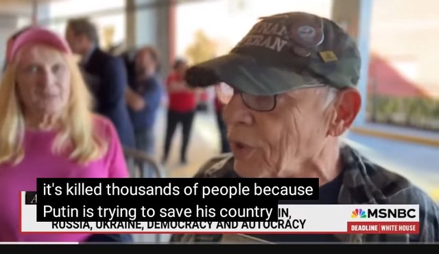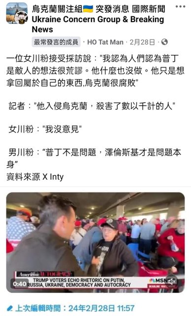 記者:身為退伍軍人,你是否擔心俄羅斯的侵略可能會超越烏克蘭嗎? 男生:我不認為普丁是問題,我認為澤倫斯基才是問題 記者:為什麼認為普丁沒問題?是他入侵了烏克蘭並殺死成千上萬的人 男生:因為普丁試圖從澤倫斯基這樣的白癡和菁英主義者手中拯救他的國家 https://i.imgur.com/MF62HSl.jpeg