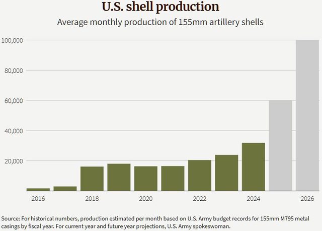 但陸軍在 2010 年代中期每月生產的砲彈數量