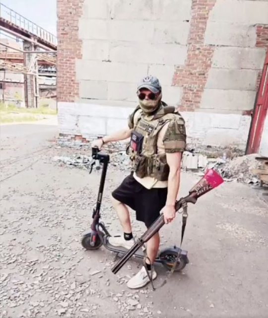 4.一名俄兵拿著反 FPV 霰彈槍和電動滑板車